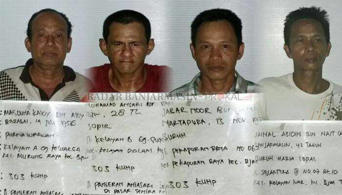 Para penjudi yang diciduk tersebut 4 orang adalah Muhammad Anshari (28) warga jalan Kelayan B Gang Sukaria Kecamatan Banjarmasin Selatan, Jabar Noor (41) warga jalan Pekapuran Raya Kecamatan Banjarmasin Timur, Zainal Abidin (42) warga jalan Sejahtera III, Kekurahan Kelayan Luar Kecamatan Banjarmasin Tengah dan Masdul Hak alias Alui (61) warga jalan Mahligai Kompleks Boga Indak I, Kecamatan Kertak Hanyar Kabupaten Banjar Provinsi Kalimantan Selatan.
