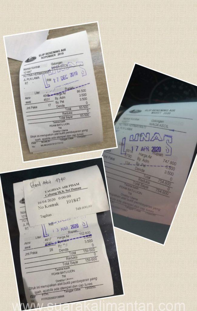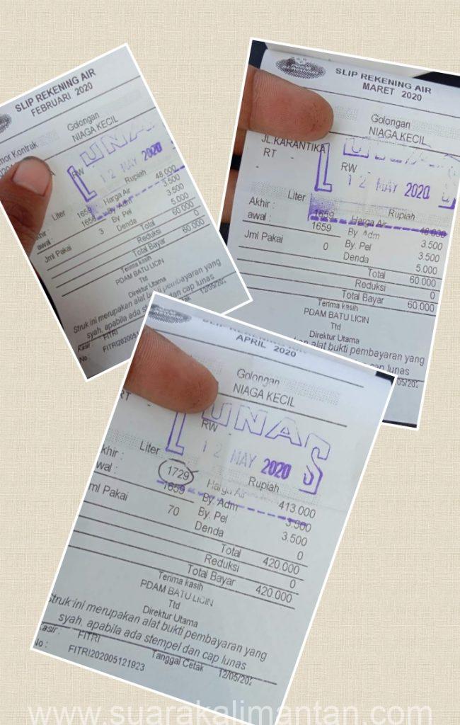 SUAKA – TANAH BUMBU. Setelah sepekan lalu PDAM IKK Satui sempat kurang lancar mengalir karena ada kerusakan, sekarang ramai menjadi perbincangan warganet tentang mahalnya tagihan Leding, seperti yang ditulis pada medsos pemilik akun facebook disebuah grup facebook “Mendadak bayar ledeng 420.000 gila tambahelagi” sembari meunggah poto slip tagihan rekening air PDAM Pada hari Selasa (12/05/2020)