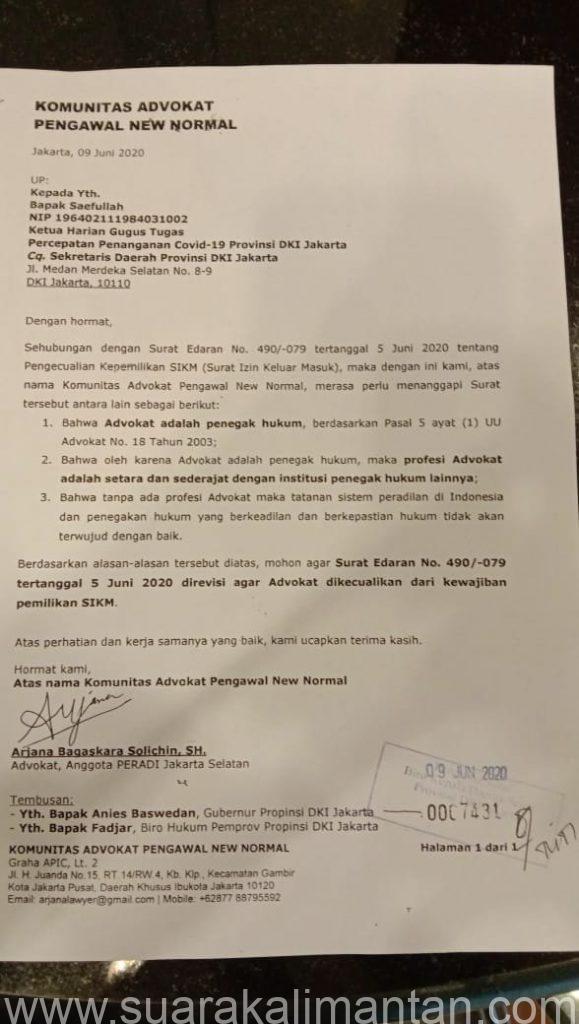 Suara Kalimantan Com, Jakarta. Juru Bicara Komunitas Advokat Pengawal New Normal kepada media mengatakan, “Ya betul Surat dari Komunitas Advokat sudah diterima hari ini oleh Tim Pemprov yang ditujukan kepada Ketua Harian Gugus Tugas Pemprov DKI, Kabiro Hukum dan Gubernur DKI Jakarta.”, ujar Arjana Bagaskara Solichin, SH kepada wartawan suarakalimantan.com, Selasa (9/6/2020).