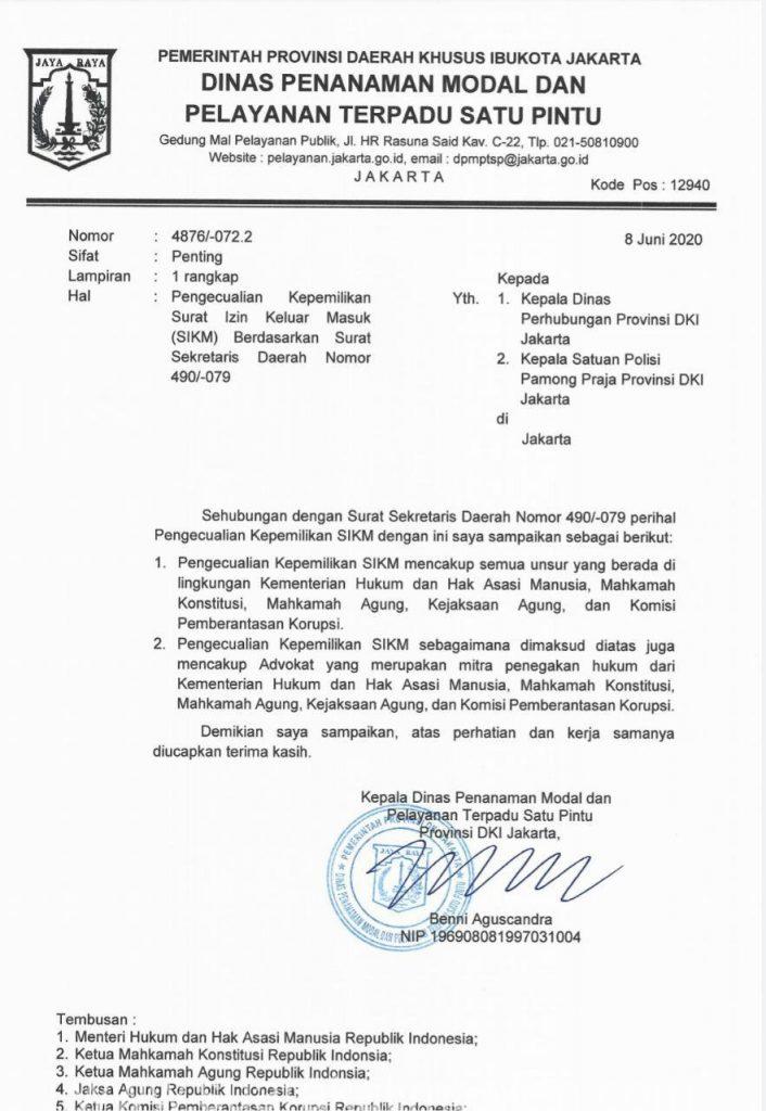 “Kemudian kami menilai adanya tumpang tindih administrasi di Pemerintahan DKI Jakarta. Surat Edaran sebelumnya mengenai Pengecualian SKIM dibuat dan di tanda tangan oleh Sekda DKI tertanggal 5 Juni 2020. Atas terbitnya surat tersebut Para Advokat menyampaikan protes keberatan karena tidak mencantumkan Advokat sebagai yg dikecualikan, kemudian atas keberatan tersebut muncul lagi Surat berikutnya tertanggal 8 Juni 2020 dari Pemerintah DKI dalam hal ini Surat dikeluarkan oleh Dinas Penanaman Modal Dan Pelayanan Satu Pintu, yg menambahkan Advokat termasuk yang dikecualikan karena mitra penegak hukum. Ini Aneh, karena apabila Surat tersebut adalah penyempurnaan dari Surat Edaran tertanggal 5 Juni, maka seharusnya Sekda DKI yang harus membuat dan menandatangani Surat berikutnya, bukan kemudian bergantian Dinas lain dalam Pemerintahan DKI yang membuat surat berikutnya.” Tegas Ombun.