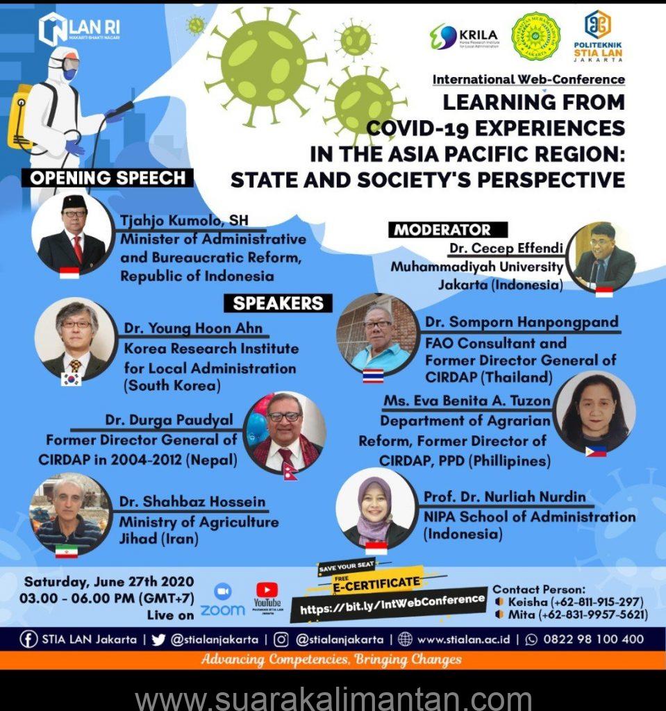 SUAKA – JAKARTA. POLITEKNIK STIA LAN Jakarta bersama Korea Research Institute for Local Administration (KRILA) dan Universitas Muhammadiyah Jakarta menyelenggarakan konferensi internasional berbasis daring bertemakan “Learning from Covid-19 Experiences in The Asia Pacific Region: State and Society’s Perspective” pada Sabtu, 27 Juni 2020.