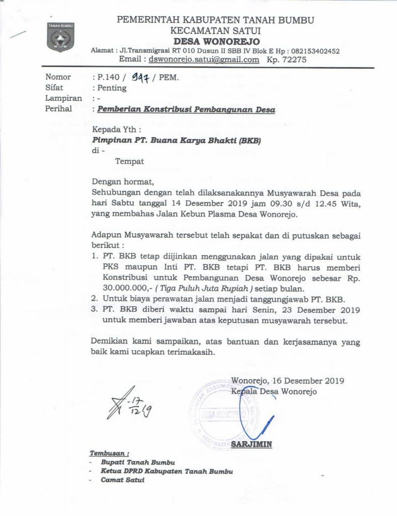 Pangkal permasalahan tersebut terjadi berawal dari pihak Pemerintahan Desa Wonorejo mengklaim jalan yang berada didalam Kebun Sawit Plasma KUD Tunas Harapan Wonorejo yang pengelolaannya dilaksanakan oleh PT.Buana Karya Bhakti (BKB) adalah jalan milik desa, dan meminta konpensasi sebesar Rp 30jt perbulan kepada PT.BKB