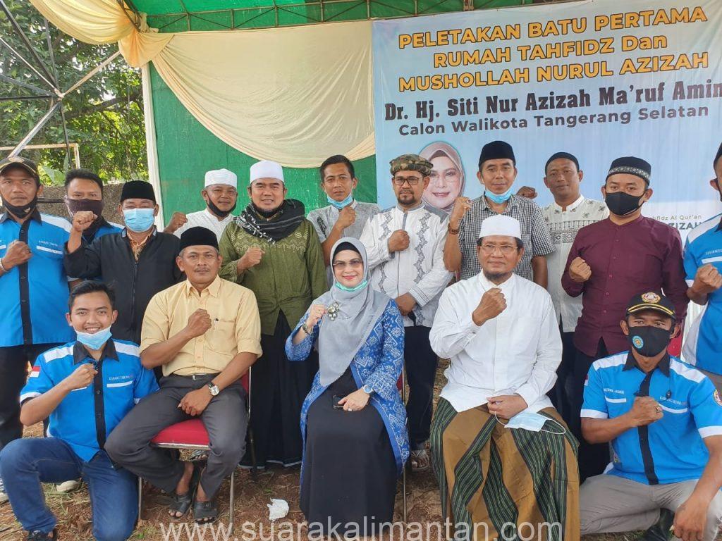 PUTRI Wakil Presiden KH Ma’ruf Amin, SitibNur Azizah bersama Ketua umum Relawan Jokowi atau ReJO HM Darmizal, meletakan batu pertama pembangunan rumah Hafidz Qur’an dan masjid Nurul Azizah pimpinan Dr. KH. Ahmad Yahya di Pabuaran, Tangerang Selatan (Tangsel), Provinsi Banten, Rabu 26 Agustus 2020.