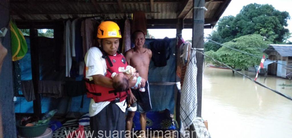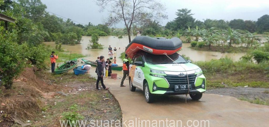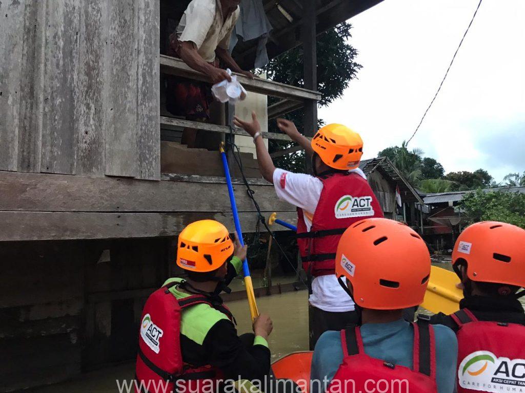 SUAKA – BATULICIN. Aksi Cepat Tanggap Kalimantan Selatan (ACT Kalsel) dan Masyarakat Relawan Indonesia (MRI) Tanah Bumbu mendistribusikan bantuan kepada warga Desa Sungai Danau dan Sinar Bulan Kecamatan Satui Kabupaten Tanah Bumbu provinsi Kalimantan Selatan yang terdampak banjir menggukan perahu karet dengan APD lengkap pada Jum’at, (04/09/2020)