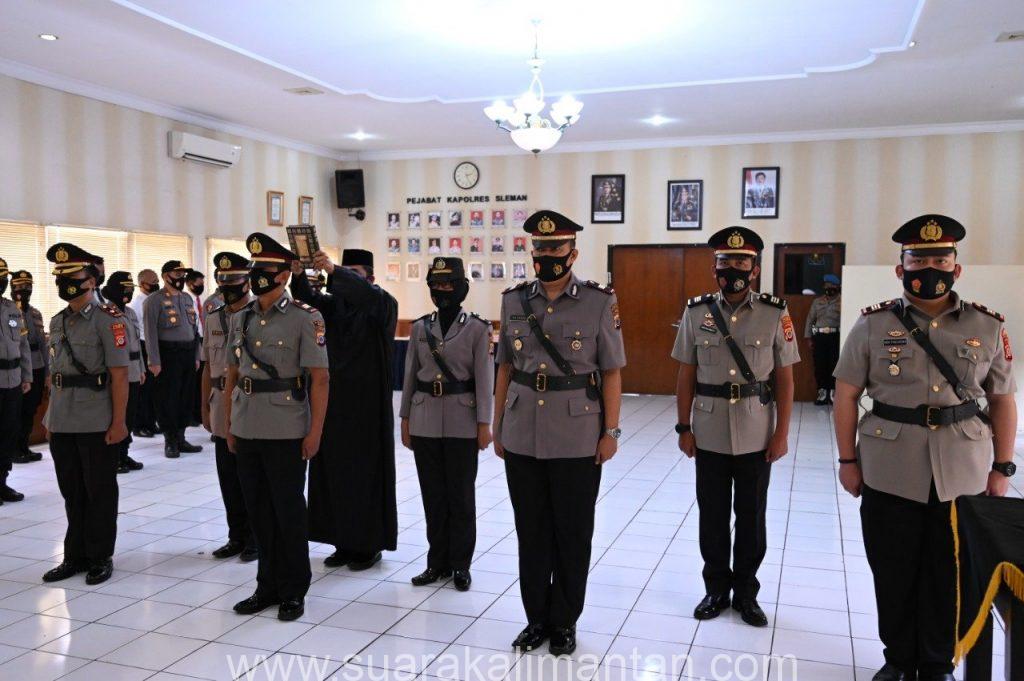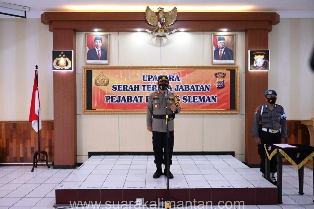 SUAKA – SLEMAN. KAPOLRES Sleman, DI Yogyakarta AKBP Anton Firmanto, memimpin serah terima jabatan (Sertijab) Kasat Narkoba, Kapolsek Kalasan, Kapolsek Seyegan serta Kasat Binmas.