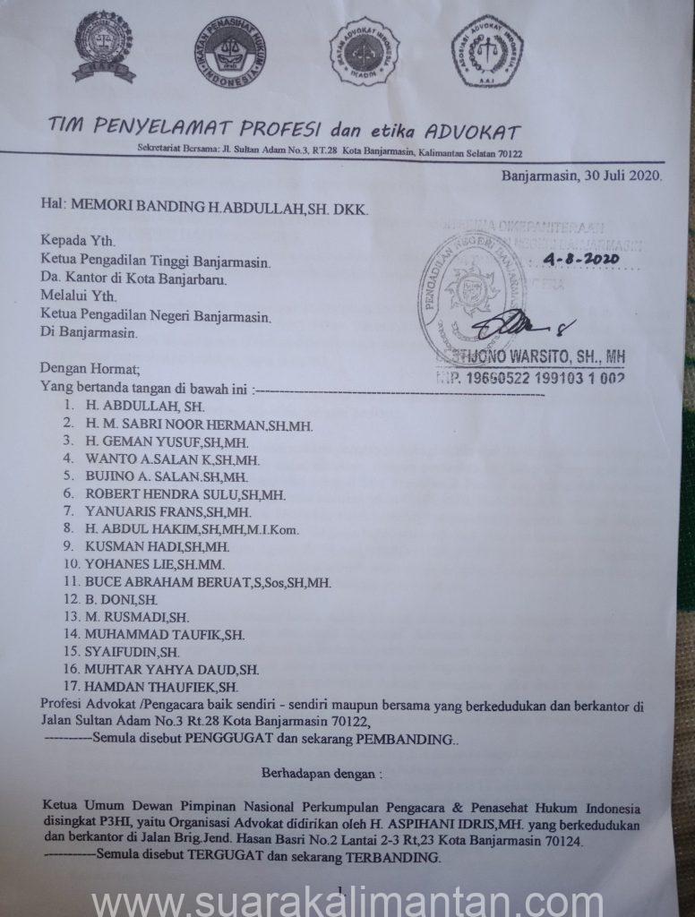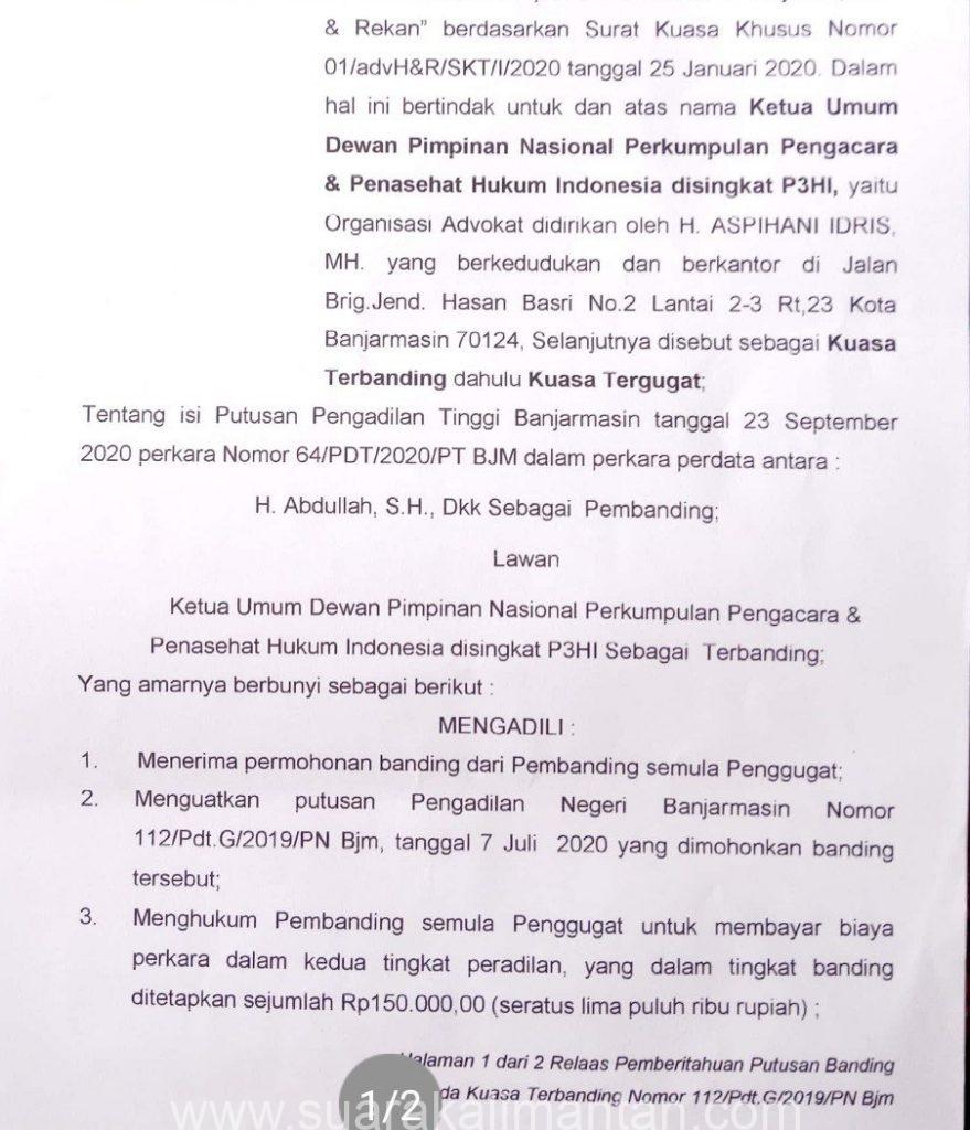 SuaraKalimantan.Com, KALSEL. BANDING gugatan para advokat senior Kalimantan Selatan H Abdullah, Taufik Hidayah, Wanto A Salan dkk yang mengatasnamakan perwakilan dari empat organisasi advokat yang terdiri dari Himpunan Advokat dan Pengacara Indonesia (HAPI), Ikatan Penasihat Hukum Indonesia (IPHI), Ikatan Advokat Indonesia (IKADIN), Asosiasi Advokat Indonesia (AAI) juga mengatasnamakan Tim Penyelamat Profesi Dan Etika Advokat terhadap organisasi advokat dan Katua Umum Perkumpulan Pengacara dan Penasehat Hukum Indonesia (P3HI) Aspihani Ideris dengan keputusan menguatkan putusan Pengadilan Negeri Banjarmasin yang memenangkan organisasi advokat P3HI satu-satunya organisasi advokat berkantor pusat dan didirikan di Kalimantan Selatan serta tidak terbukti bahwa ketua umum P3HI bersalah.