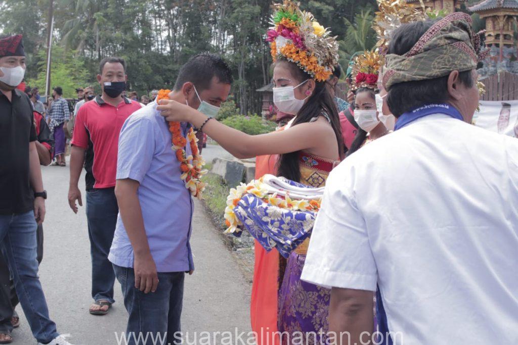 SUAKA – BATULICIN. Calon Bupati Syafruddin H Maming (SHM) disambut dengan iring-iringan Baleganjur dan tarian Puspawresti adat dari Bali, di desa Maju Sejahtera Kecamatan Karang Bintang kabupaten Tanah Bumbu pada Selasa, (06/10/2020)