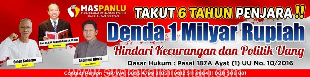 “Saya ingatkan dalam UU No. 10 tahun 2016 itu ada sanksi pidana, denda dan diskualifikasi bagi Paslon melakukan politik uang. Sanksi itu berlaku bagi pemberi, perantara, maupun penerima dijerat hukum yang sama dengan pidana 6 tahun penjara hingga denda 1 milyar rupiah,” kata Aspihani.