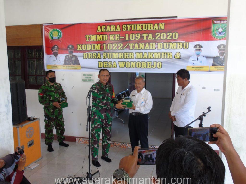 SUAKA – BATULICIN. Kodim 1022 Tanah Bumbu melaksanakan syukuran bersama masyarakat atas kelancaran kegiatan TNI Manunggal Membangun Desa (TMMD) ke-109 yang sudah selesai 100 persen setiap sasaran. Acara syukuran digelar dibalai desa Wonorejo kecamatan Satui pada Rabu, (21/10/2020)