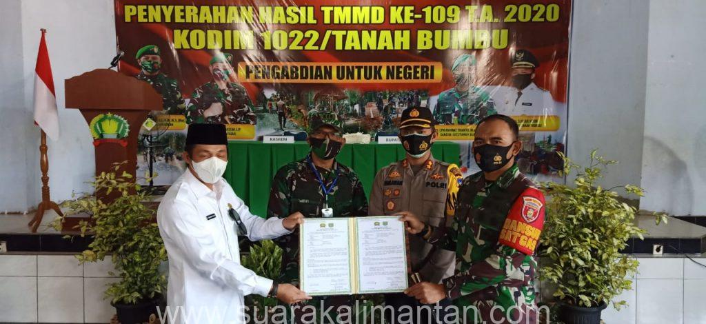 SUAKA – BATULICIN. Acara Penutupan dan Penyerahan Hasil Tentara Manunggal Membangun Desa (TMMD) Ke-109 TA 2020 Dansatgas TMMD juga selaku komandan Kodim 1022 Tanah Bumbu Letkol Cpn Rahmat Trianto, M.Si,Tr (Han) kegiatan TMMD ditutup oleh Kasrem 101 Antasari Kolonel Inf Parulian Marpaung, S.Sos, MM di Desa Sumber Makmur Rabu, (21/10/2020)
