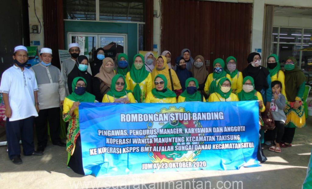 SUAKA – BATULICIN. Koperasi Simpan Pinjam dan Pembiayaan Syariah (KSPPS) dari Baitul Maal wat Tamwil (BMT) Salah satu Lembaga Keuangan Mikro Syariah yang ada di wilayah kecamatan Satui kabupaten Tanah Bumbu hari ini menerima kunjungan kerja/studi banding dari Koperasi Wanita Manuntung, silaturahmi di gelar dihalaman kantor BMT Al Falah desa Sungai Danau Jumat, (23/10/2020).
