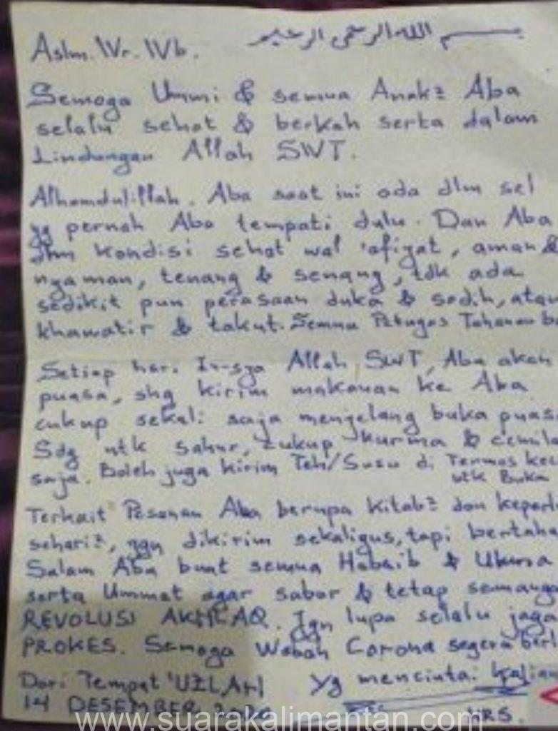 suarakalimantan.com – Jakarta. Imam Besar Front Pembela Islam (FPI) Muhammad Rizieq Shihab menuliskan sebuah surat dengan tulisan tangannya sendiri kepada istri dan anaknya dari balik tahanan Ditresnarkoba Polda Metro Jaya.