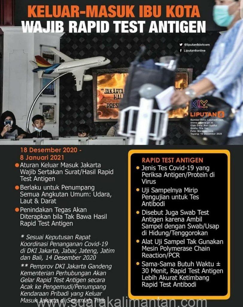 suarakalimantan.com – Jakarta. Pemerintah DKI Jakarta mulai memperketat peraturan guna menekan penyebaran Covid-19. Salah satu aturan tersebut adalah semua penumpang Angkutan Umum, Udara, Laut dan Darat wajib membawa surat rapid test antigen bagi individu yang hendak keluar-masuk Jakarta. Aturan ini berlaku mulai 18 Desember 2020 sampai 8 Januari 2021.