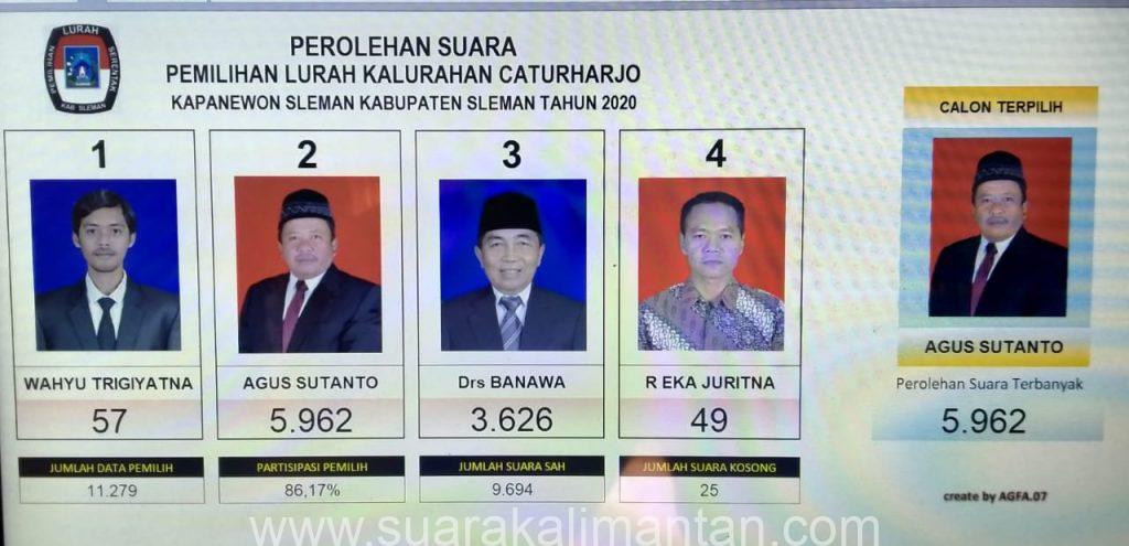 Dari empat calon Kades yang berlaga di desa Caturharjo, Agus Sutanto memperoleh suara terbanyak yakni 5.692 suara atau 86,17 persen.