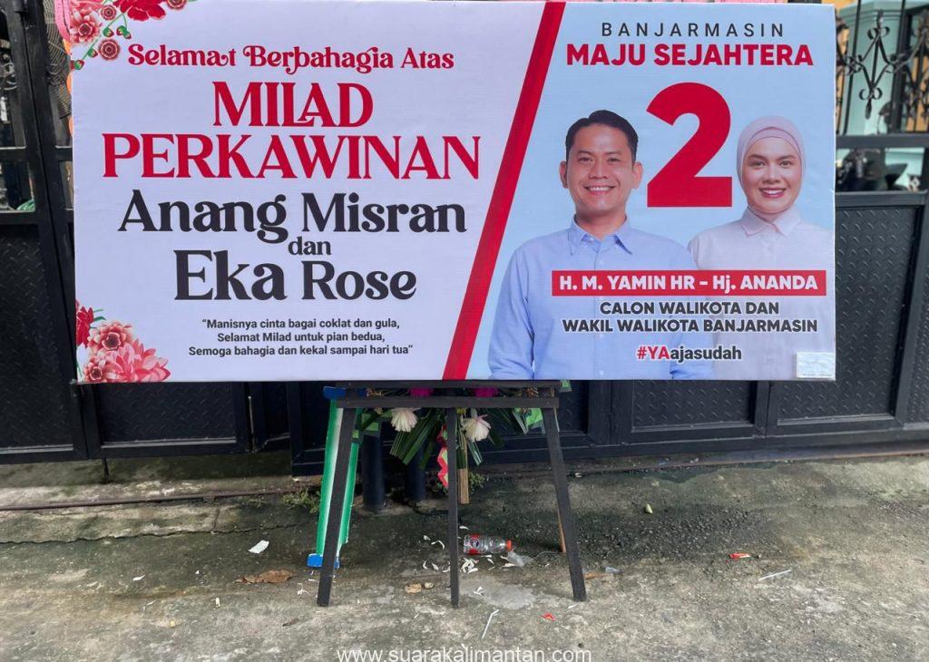 “Manisnya cinta bagai coklat dan gula, Selamat Milad untuk pian berdua, Semoga bahagia dan kekal sampai hari tua” pujangga tertulis dalam karangan bunga yang di buat calon Wali Kota Banjarmasin Nomor Urut 2 ini.