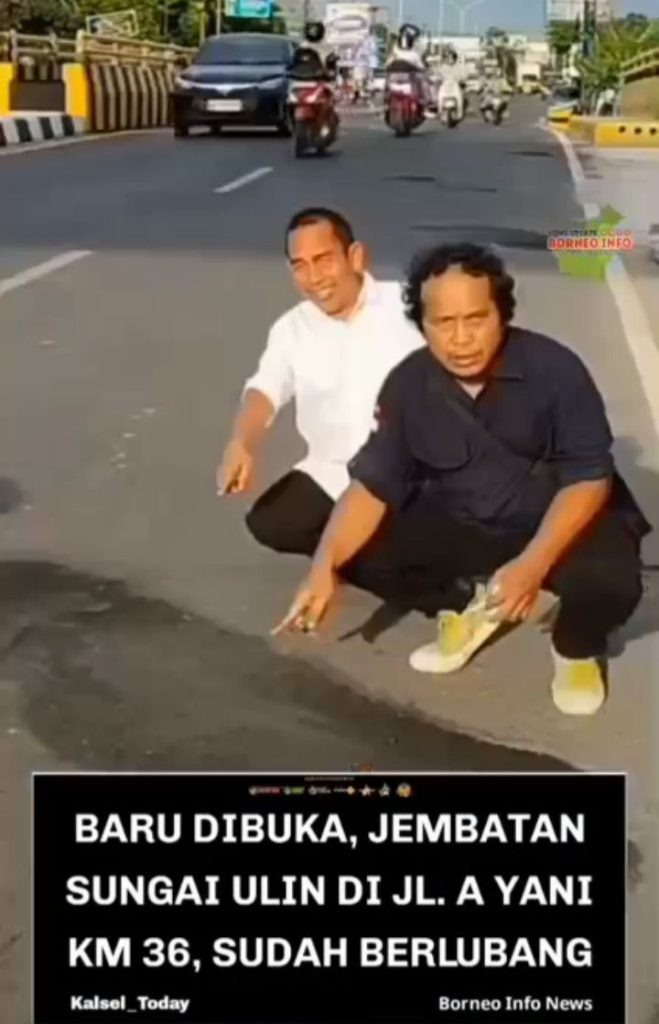 Banjarbaru SUARA KALIMANTAN — Sejumlah warga yang dipimpin pemerhati kebijakan daerah, Aliansyah, mempertanyakan kualitas sebuah jembatan di Banjarbaru yang baru rampung sekitar 10 hari lalu. Temuan di lapangan menunjukkan beberapa titik jalan di sekitar jembatan tersebut sudah mengalami kerusakan dan berlubang.