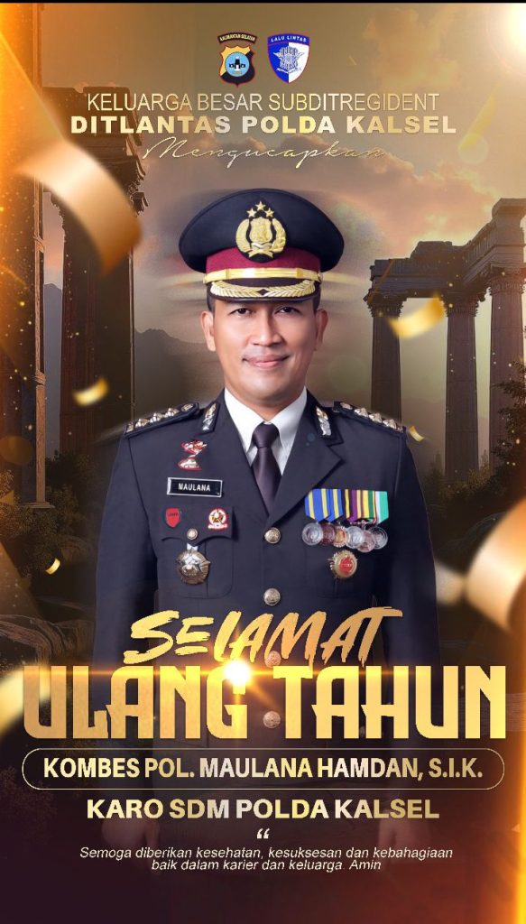 Banjarbaru – SUARA KALIMANTAN – menyampaikan ucapan selamat ulang tahun kepada Kombes Pol. Maulana Hamdan, S.I.K., yang saat ini menjabat sebagai Kepala Biro Sumber Daya Manusia (Karo SDM) Polda Kalimantan Selatan.