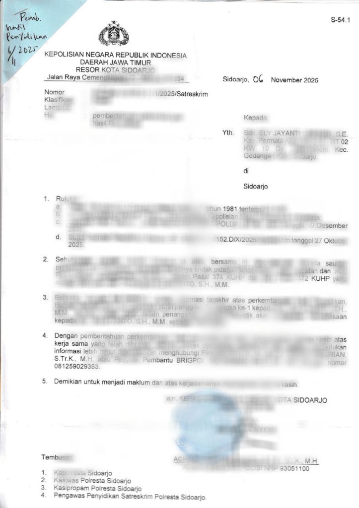 Pada 4 Desember 2024, penyidik Reskrim Polres Sidoarjo melakukan penyitaan terhadap sertifikat yang berada di kantor terlapor. Penyidik juga meminta keterangan ahli pidana Dr. Slhdn, S.H., M.H. dari Universitas Bhayangkara Surabaya, yang menyimpulkan bahwa perbuatan terlapor memenuhi unsur pasal 372 dan 378 KUHP.