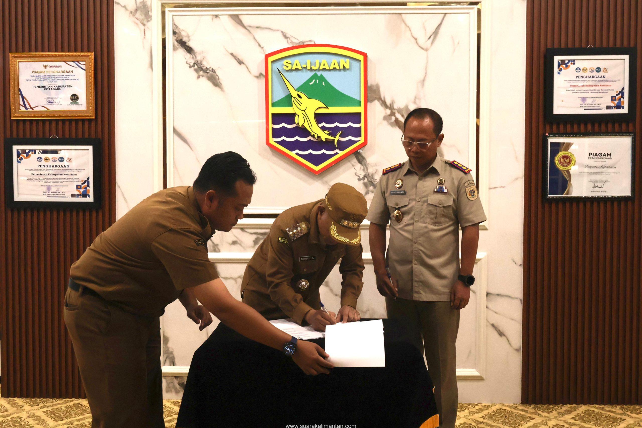 Penyerahan ditutup dengan Penandatanganan Berita Acara Hibah Barang Milik Daerah Kotabaru, dan foto bersama. (Rahmad)