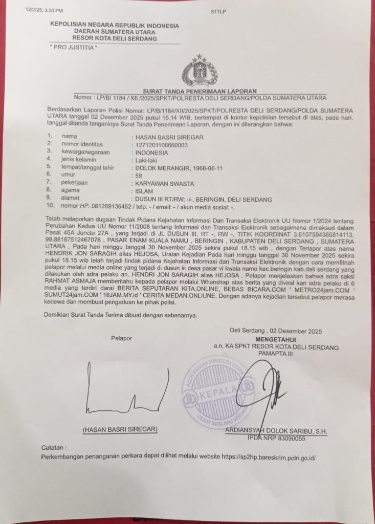 Ketua Jajaran Wartawan Indonesia (JWI) Deli Serdang, Hasan Basri Siregar, secara tegas membantah tuduhan fitnah yang tersebar di beberapa media online tanpa konfirmasi resmi. Melalui kuasa hukumnya, Jhon Erwin Tambunan SH, Hasan Basri mengambil langkah tegas dengan melaporkan perkara tersebut ke Polresta Deli Serdang, Selasa (2/12/2025).