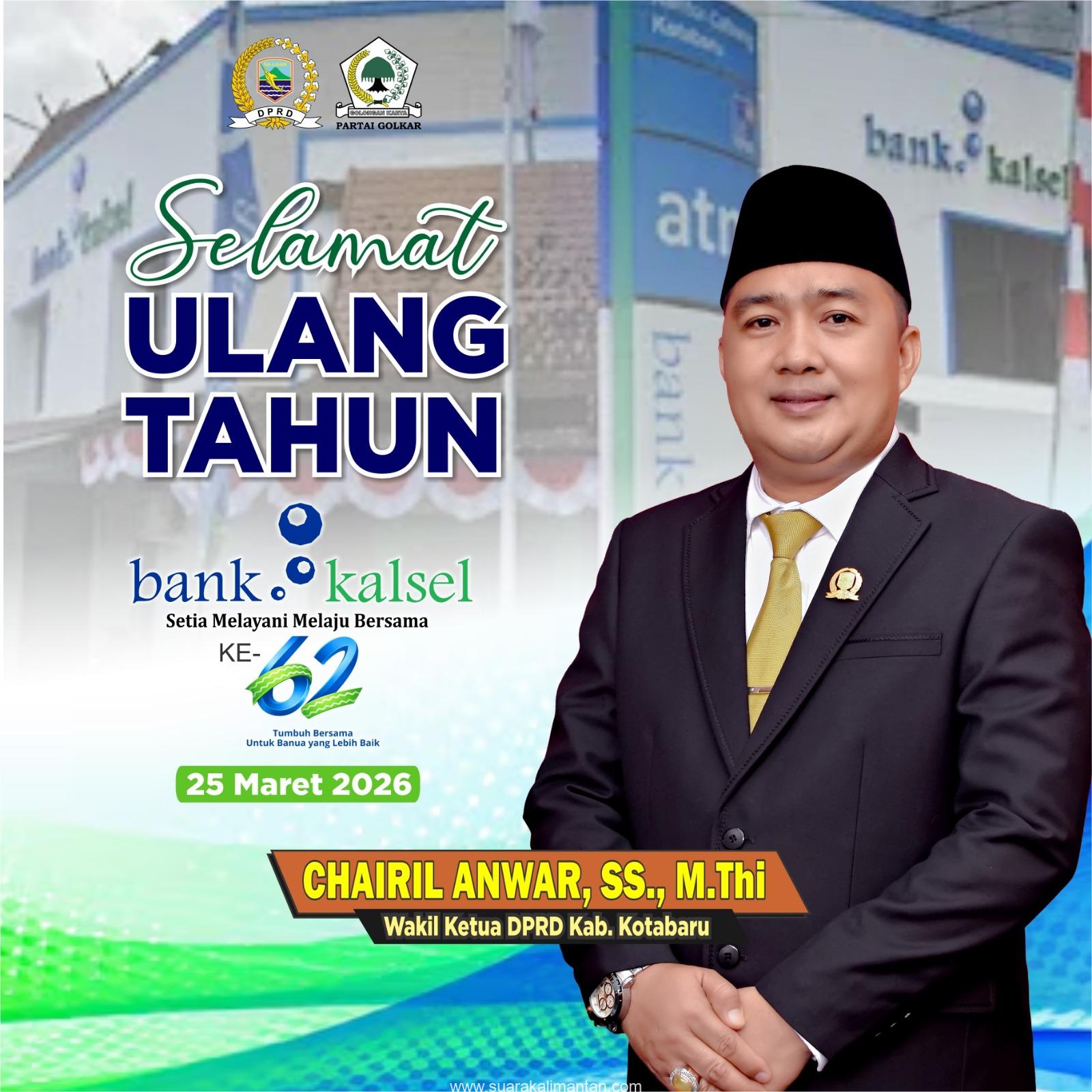 SUAKA – KOTABARU. Wakil Ketua DPRD Kabupaten Kotabaru, Chairil Anwar, menyampaikan ucapan selamat ulang tahun ke-62 Bank Kalsel pada Rabu (25/3/2026).