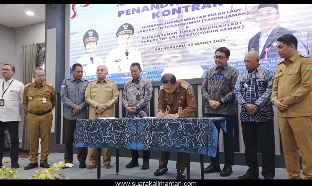SUAKA – KOTABARU. Bupati Kotabaru H. Muhammad Rusli, S.Sos menghadiri penandatanganan kontrak kerjasama lanjutan proyek strategis pembangunan Jembatan Pulau Laut. Acara yang berlangsung di Aula Kantor Dinas Pekerjaan Umum dan Penataan Ruang Provinsi Kalimantan Selatan ini melibatkan Pemerintah Provinsi Kalsel, Kabupaten Kotabaru, dan Kabupaten Tanah Bumbu, serta disaksikan langsung oleh Gubernur Kalsel H. Muhidin dan Bupati Tanah Bumbu Andi Rudi Latif, Senin 30 Maret 2026.